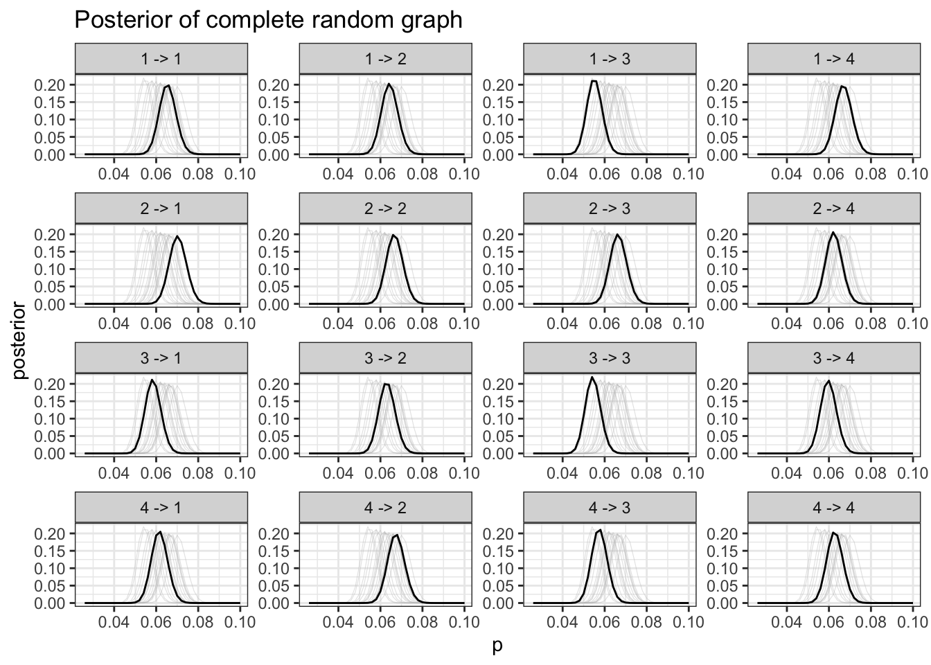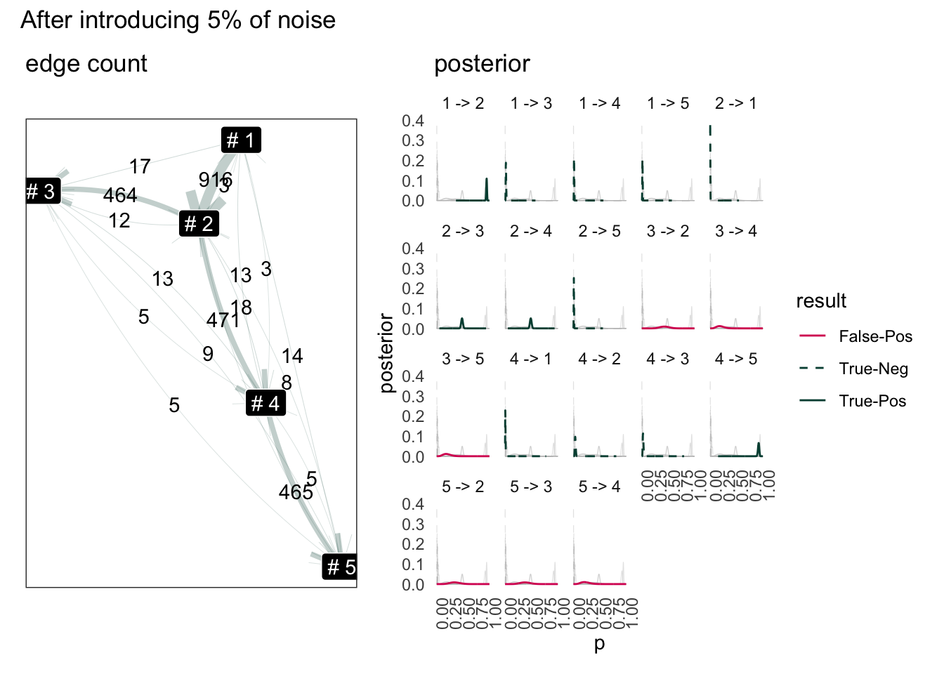 The socring here is very simple. Use 5% as threshold. If there is a “good chance” that the intrinsic probability of edge is less than 5%, this edge is ignorable. Otherwise keep it. The “good chance” means sum posterior below “5 %” p. Here is just a simple rounding up.