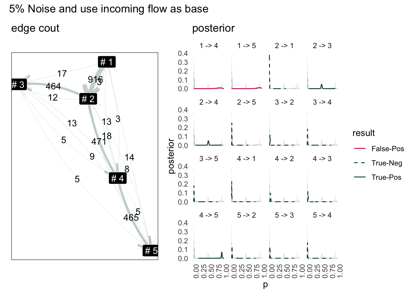 “1->2” has disappeared from posterior because the number of edge pointing to “#1” is lower than the amout going out. So “#1” going out to “#2” is simply impossible. Knowing this we can probability fix this simply add difference out out-flow from 1.