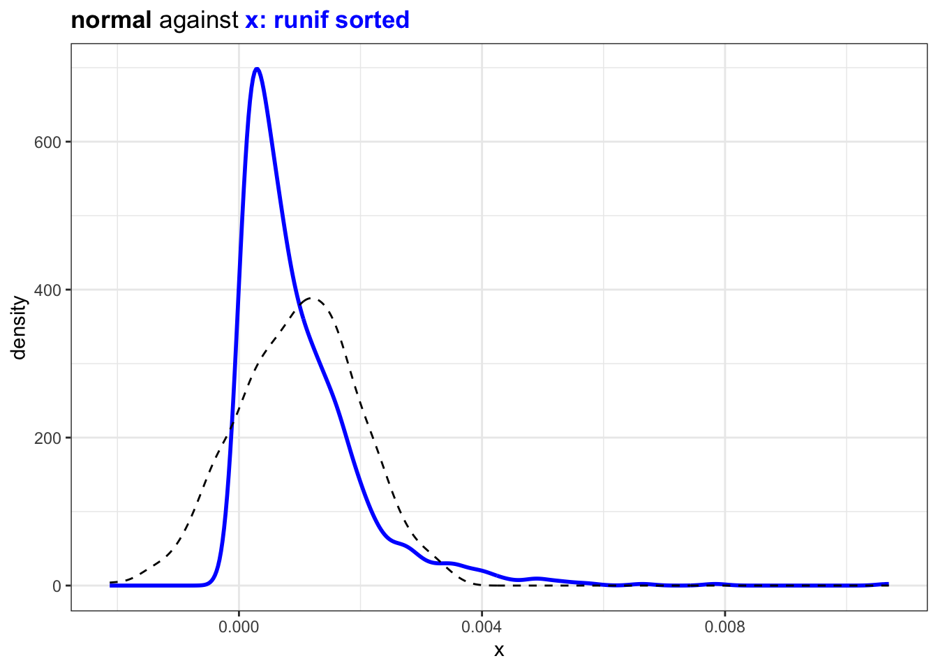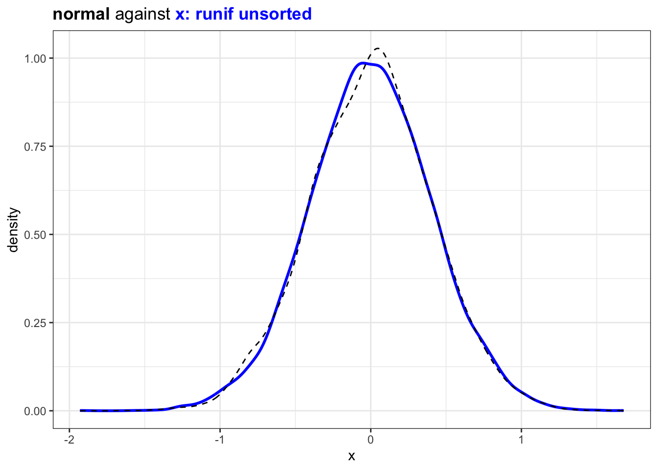 ggtitle("<b>normal</b> against <b style='color:blue'>x: runif unsorted</b>")