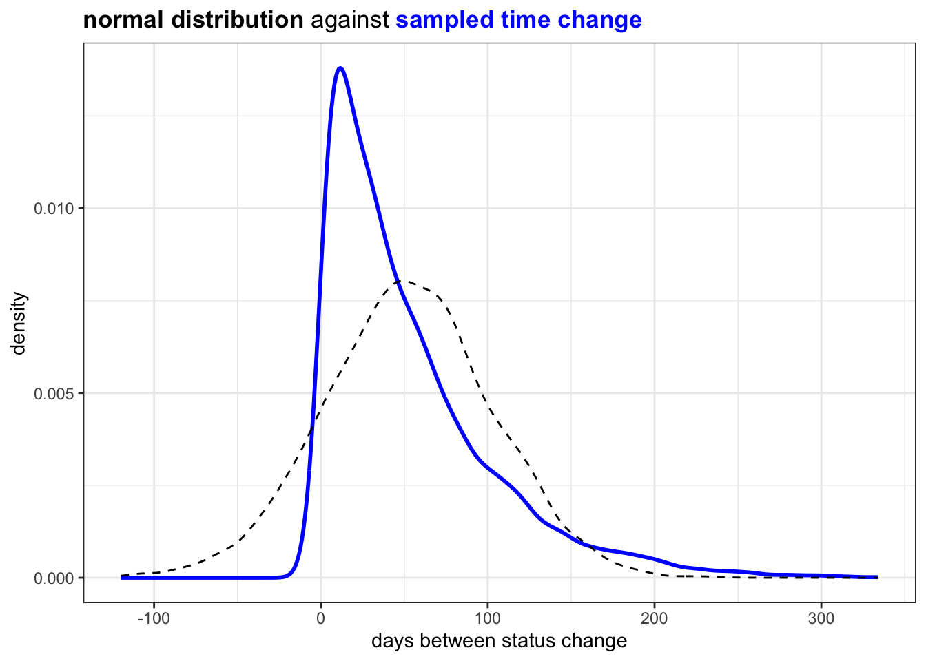 ggtitle("<b>normal distribution</b> against <b style='color:blue'>sampled time change </b>") +